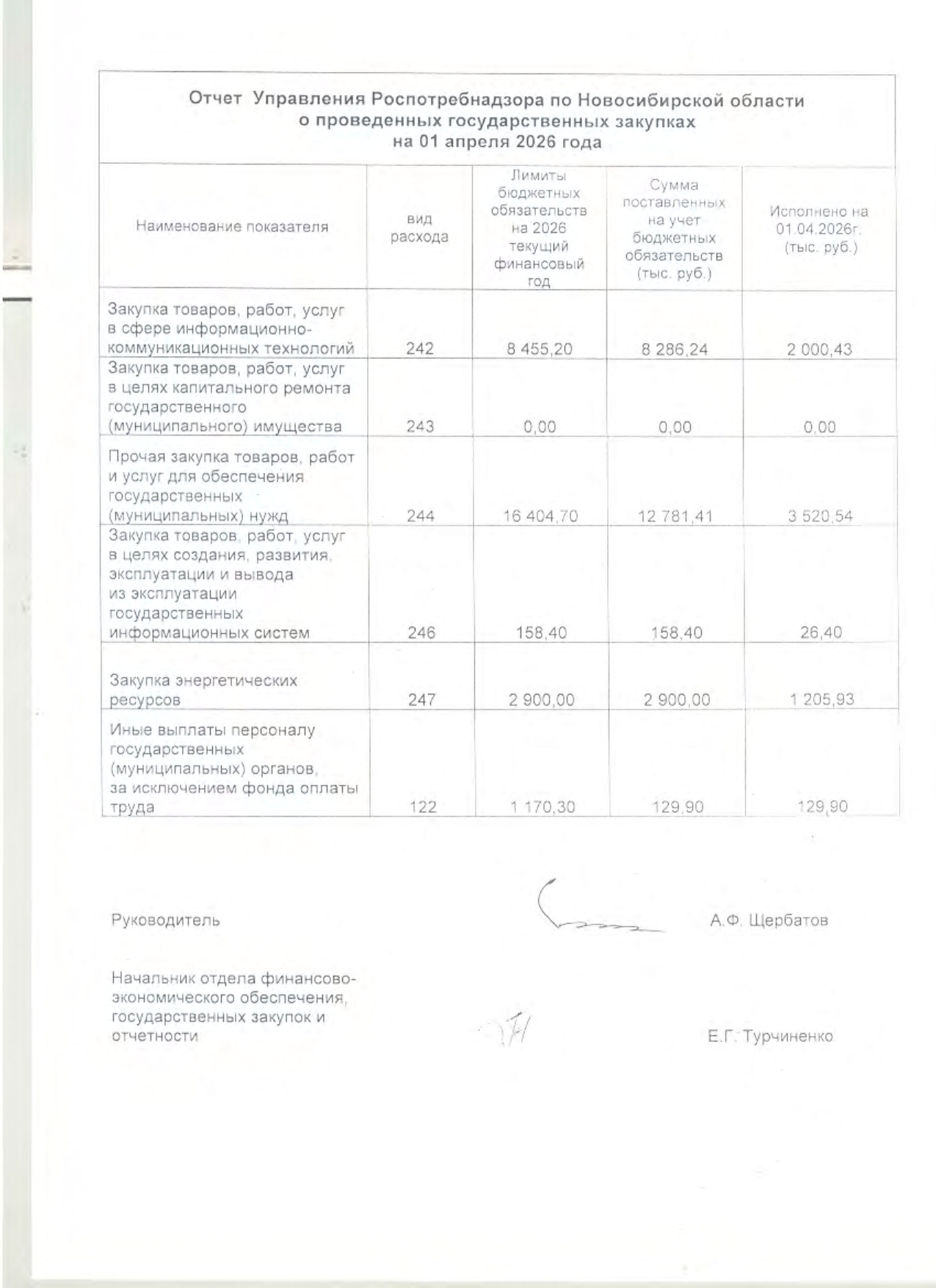Отчет Управления Роспотребнадзора по Новосибирской области о проведенных государственных закупках на 01 апреля 2026 года