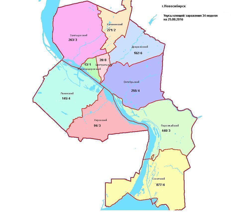 Наибольшее количество покусов регистрируется на территории Новосибирского, Искитимского, Тогучинского, Мошковского, Ордынского, Коченевского, Маслянинского районов области и Советском, Первомайском, Калининском, Заельцовском, Октябрьском районах г. Новосибирска и в г.Бердске.