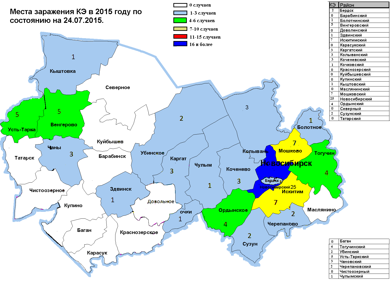 108 заболевших КЭ отмечали покусы, либо наползания клещей на территории Новосибирской области (приложение «Места заражения КЭ на территории Новосибирской области»).
