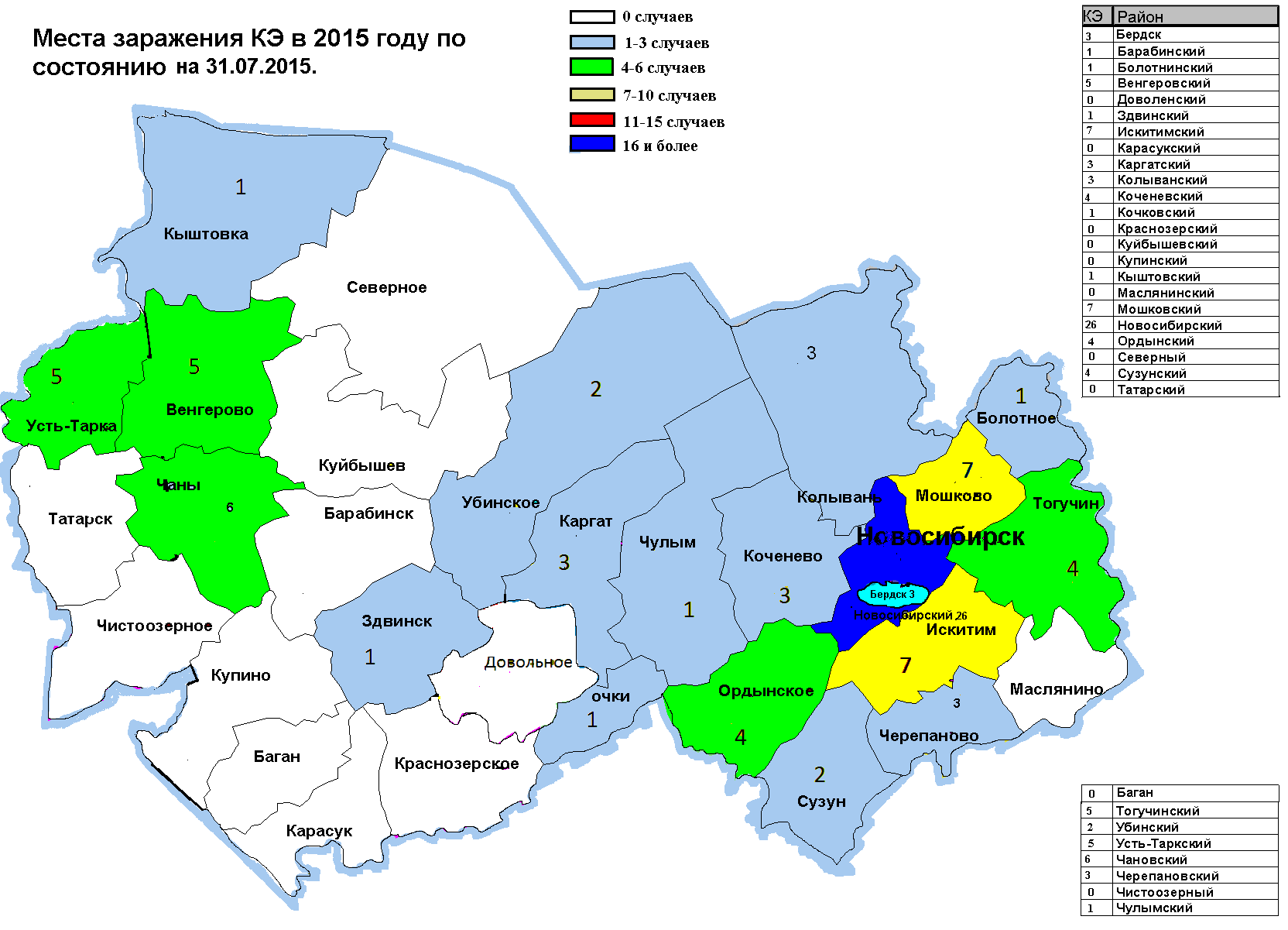 Покусы произошли на всех эндемичных территориях, в т.ч. максимальное количество покусов на территории районов: Тогучинский район – 1771 покусов, Новосибирский – 2699, Искитимский и Мошковский – 1419 и 1389 соответственно, Советский – 1137, г. Бердск – 646.