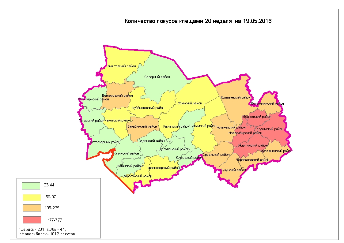 Наибольшее количество покусов зарегистрировано в Новосибирском, Искитимском, Коченевском, Тогучинском, Убинском, Венгеровском, Колыванском, Ордынском, Мошковском районах области, г. Бердске и в Советском, Заельцовском, Калининском, Ленинском районах г. Новосибирска (Карта Новосибирской области - территории с наибольшим количеством покусов).