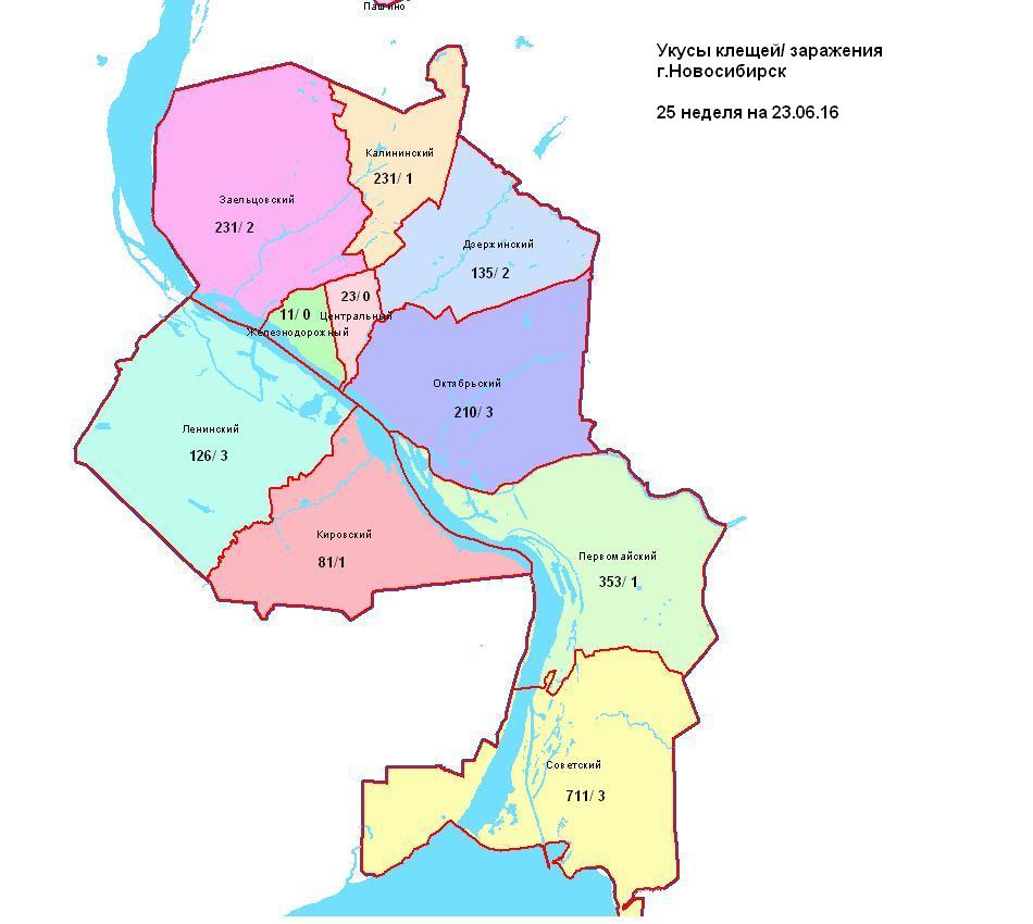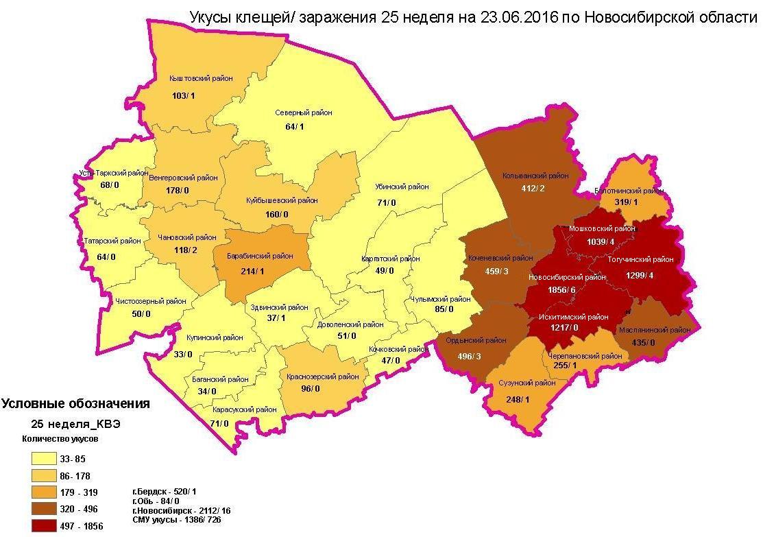 Наибольшее количество покусов зарегистрировано в Новосибирском, Искитимском, Мошковском, Тогучинском, Ордынском, районах области, и в Советском, Первомайском, Октябрьском, Заельцовском и Калининском районах г. Новосибирска, г.Бердске (Покусы и заражения_на 24.06.2016_Новосибирская область, Покусы и заражения_на 24.06.2016_г.Новосибирск).