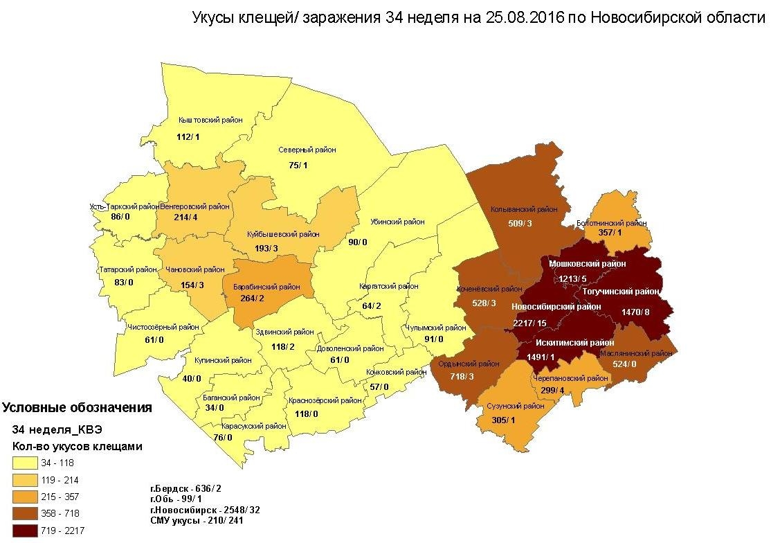 Наибольшее количество покусов регистрируется на территории Новосибирского, Искитимского, Тогучинского, Мошковского, Ордынского, Коченевского, Маслянинского районов области и Советском, Первомайском, Калининском, Заельцовском, Октябрьском районах г. Новосибирска и в г.Бердске.