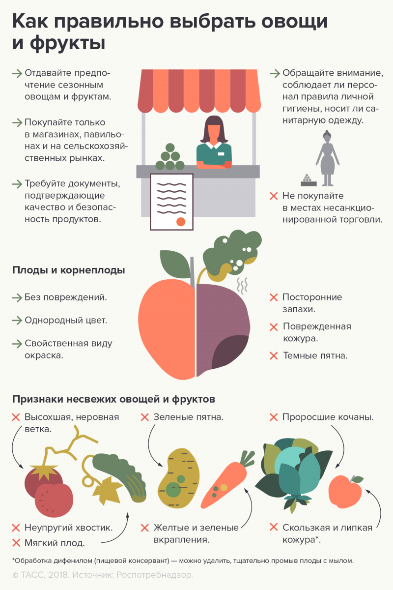 Покупать фрукты, овощи лучше в сезон их созревания. Они должны быть спелыми, с неповрежденной кожицей, без признаков гниения.