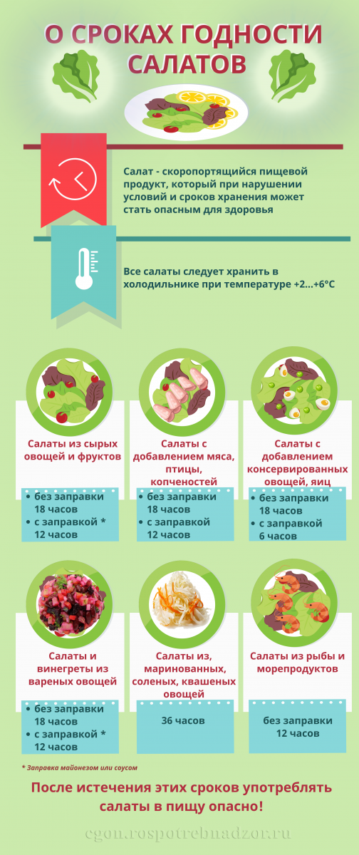 -не храните скоропортящиеся продукты и готовые салаты при комнатной температуре более 2-х часов, так как это может привести к накоплению бактерий и токсинов и привести к возникновению острых кишечных инфекций или пищевых отравлений при употреблении таких продуктов;