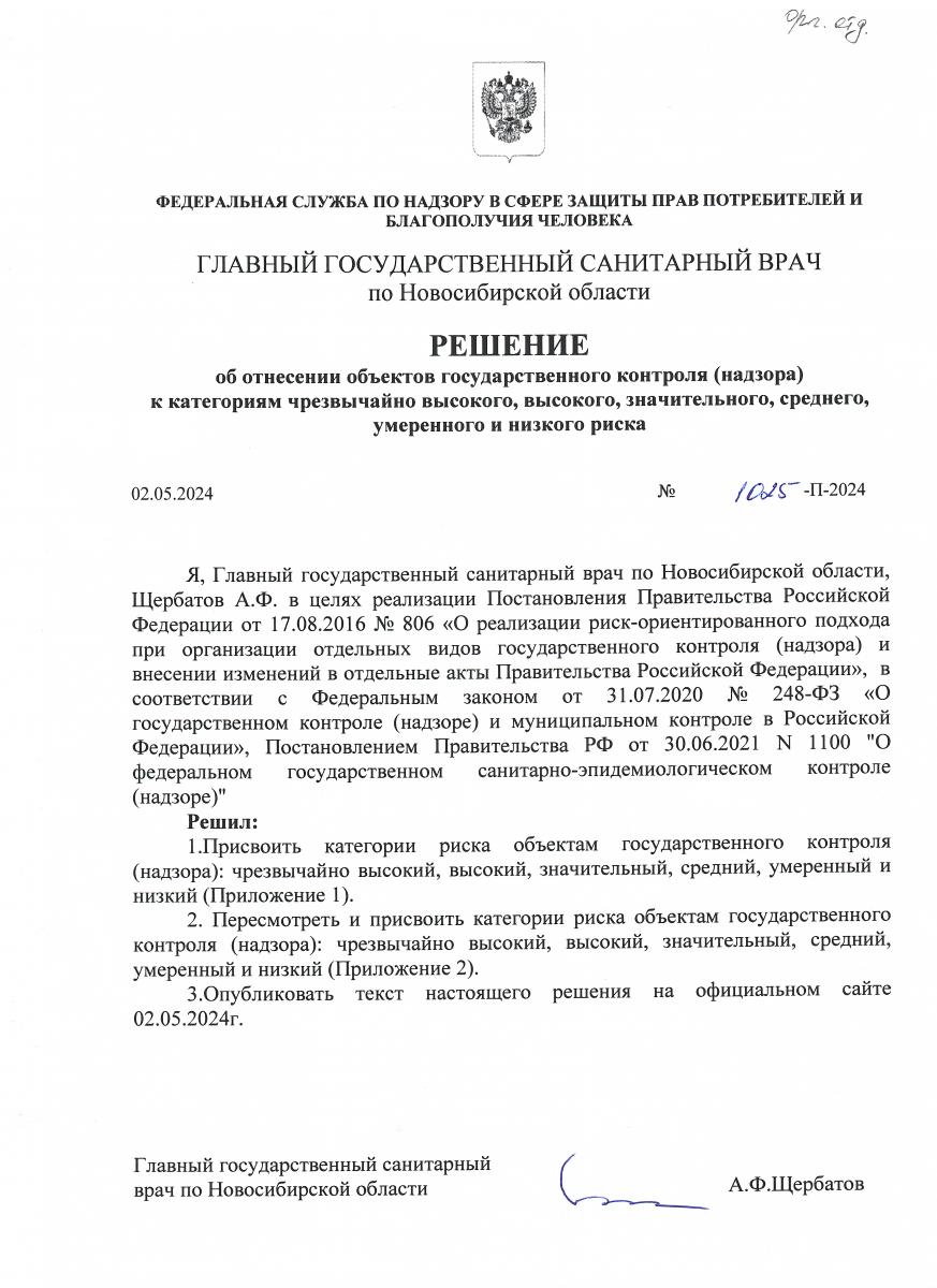 Решение об отнесении объектов надзора к категориям риска от 02.05.2024 № 1025-П-2024